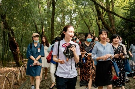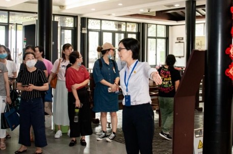 隨后,在景區(qū)高級(jí)講解員俞昕的帶領(lǐng)下,學(xué)員們參觀了蘭亭景區(qū),也現(xiàn)場體驗(yàn)了巾幗文明崗的日常工作。在接下來的交流會(huì)上,景區(qū)宣教部主任、巾幗文明崗副崗長蔡益萍向大家介紹了該巾幗文明崗的創(chuàng)建歷程和特色工作。她從崗位介紹、風(fēng)采展示、成績榮譽(yù)和未來展望四個(gè)方面向大家介紹了文明崗的管理模式和工作開展。該巾幗文明崗是以“對(duì)內(nèi)提升+對(duì)外展示”相結(jié)合為特色的爭創(chuàng)崗,通過開展各類活動(dòng),力爭服務(wù)游客,普及書法文化。