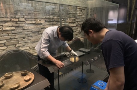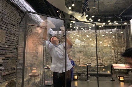 為使清潔工作更加順利、高效,工作人員進(jìn)行了分工合作,有套上鞋套、拿著清潔工具進(jìn)入展柜中清潔的,有負(fù)責(zé)引導(dǎo)的。由于空間狹小,工作人員先將展品移出展柜,在對(duì)展柜玻璃進(jìn)行清潔的同時(shí)也對(duì)展面與展臺(tái)進(jìn)行打掃。這一過(guò)程中,總會(huì)有沒(méi)有清潔到的地方或死角,站在展柜外的人員就及時(shí)對(duì)里面的人進(jìn)行提醒與引導(dǎo),使清潔工作進(jìn)行地更加全面與徹底。完成展柜玻璃及展臺(tái)的除塵清理工作后,工作人員還對(duì)個(gè)別展品的小標(biāo)簽進(jìn)行了更換調(diào)整,以使標(biāo)簽樣式統(tǒng)一、美觀。