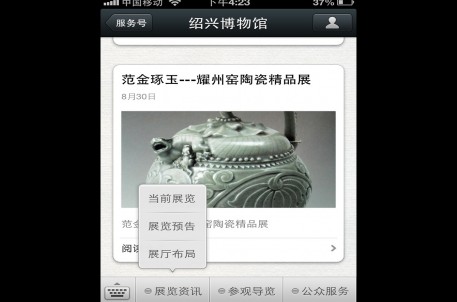 隨著公眾微信號(hào)的服務(wù)號(hào)與訂閱號(hào)分設(shè),日前,紹興博物館官方微信進(jìn)行了升級(jí),從單一的語(yǔ)音導(dǎo)覽增加到展覽資訊、參觀(guān)導(dǎo)覽、公眾服務(wù)信息三大部分內(nèi)容。觀(guān)眾關(guān)注紹興博物館官方微信,即可獲取紹興博物館開(kāi)放時(shí)間、領(lǐng)票信息、展覽/講座信息、展覽講解、查詢(xún)交通/咨詢(xún)電話(huà)等,可以完全掌握博物館的服務(wù)資訊。