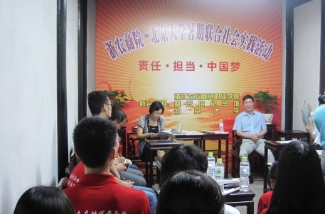 6月30日上午9點(diǎn),北京大學(xué)元培學(xué)院和浙江農(nóng)業(yè)商貿(mào)職業(yè)技術(shù)學(xué)院的師生們?cè)诮B興蔡元培故居舉行了以“責(zé)任、擔(dān)當(dāng)、中國夢(mèng)”為主題的大學(xué)生暑期社會(huì)實(shí)踐活動(dòng)啟動(dòng)儀式。啟動(dòng)儀式由紹興市名人研究所所長章大國主持,浙農(nóng)商院書記邵田田和紹興市旅游集團(tuán)有限公司董事長沈安龍先出席本次活動(dòng)并作了熱情洋溢的發(fā)言。