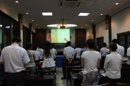 “感恩的心,感謝有你……”嘹亮的歌聲從蘭亭景區(qū)的報(bào)告廳中傳出。這是蘭亭景區(qū)正在進(jìn)行道德講堂的第二講——職業(yè)道德。