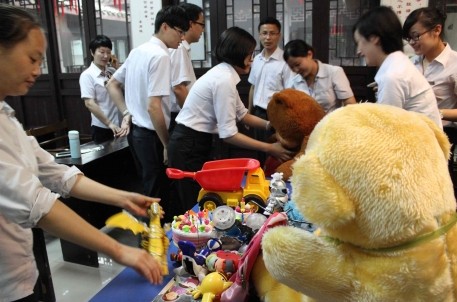 這次的道德講堂還是依然分為八個環(huán)節(jié)展開:自我反省、唱歌曲、學(xué)模范、誦經(jīng)典、談感悟、送吉祥、向“德”字鞠躬和做善事。相比第一次的道德講堂,這次活動的開展在有了一定經(jīng)驗(yàn)的基礎(chǔ)上準(zhǔn)備的更加充分和仔細(xì),尤其是最后的做善事環(huán)節(jié),景區(qū)事先特意聯(lián)系了任家塔民工子弟幼兒園,決定發(fā)動員工為該幼兒園的小朋友們捐贈玩具和書籍。在講堂上,不僅員工們將自己家中適合小朋友的各種圖書和玩具捐獻(xiàn)了出來,景區(qū)也代表單位購買捐獻(xiàn)了10套嶄新的玩具,向這些離鄉(xiāng)背景來紹興工作的民工子弟表達(dá)了愛心與祝福。