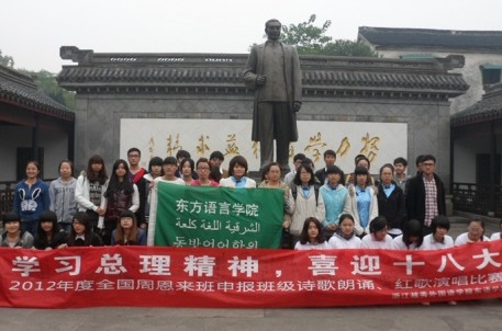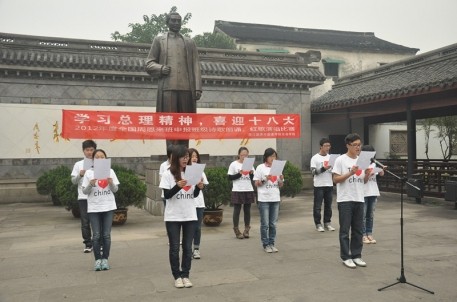 11月8日下午,“學(xué)習總理精神,慶祝十八大勝利召開”紹興越秀外國語學(xué)院東語學(xué)院2012年度全國周恩來班申報班級詩歌朗誦、紅歌演唱比賽在周恩來紀念廣場舉行。 在黨的十八大勝利召開之際,學(xué)校舉行此次活動,不但集中展示了東語學(xué)子的精神風貌和文化修養(yǎng),同時也激發(fā)了學(xué)生的積極性,進一步明確“為中華之崛起而讀書”的責任感和使命感。(名人故居 李娜)