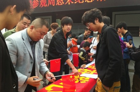 10月30日,來(lái)自浙江工業(yè)職業(yè)技術(shù)學(xué)院機(jī)電四班的25位業(yè)余黨校成員,到周恩來(lái)紀(jì)念館,開(kāi)展了一場(chǎng)主題為"喜迎中共十八大,黨在我心中”的活動(dòng)。他們有的組織游客在紅色的布上簽名,有的為游客介紹中共的歷史。(名人故居 胡越)