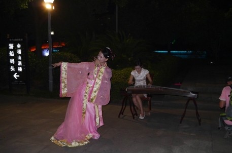 祭月是紹興古老的中秋習(xí)俗之一。當(dāng)晚,皓月當(dāng)空,我們?cè)谟碜闶瘡V場(chǎng)上放置了祭桌,桌上供上月餅、葡萄、蘋果、老南瓜等祭品,點(diǎn)上一柱清香,一對(duì)紅燭,由身著漢服的年輕人為大家表演紹興傳統(tǒng)的祭月儀式。在場(chǎng)的市民朋友被這古樸莊重的祭月儀式所吸引,紛紛陶醉其間。儀式結(jié)束后主祭人將象征著和諧團(tuán)圓的月餅分切開來,送給在場(chǎng)的每一位游客,一起分享美味的月餅?;顒?dòng)現(xiàn)場(chǎng),身著漢服的女子在古箏的伴奏下翩翩起舞,婀娜多姿的舞步仿佛要帶我們穿越到漢唐。同時(shí),漢服愛好者們還點(diǎn)亮了一盞盞五彩河燈,將它們放入河中。河燈承載著大家美好的祝福與期盼,緩緩地漂向遠(yuǎn)方......