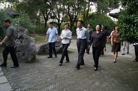 王忠禹先生在景區(qū)講解員的陪同和講解下,興致勃勃地參觀了六朝井亭、孤鶴軒、釵頭鳳碑和宋井亭等景點(diǎn),并在各主要景點(diǎn)合影留念。在細(xì)心聽取講解之后,王忠禹先生對沈園歷史變遷產(chǎn)生了濃厚興趣,并對恢復(fù)擴(kuò)建后的沈園新貌表達(dá)了由衷的贊嘆。