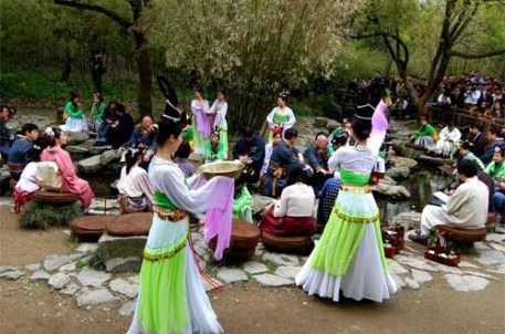 伴隨音樂響起,演藝人員緩緩從竹林出來,進行修禊舞蹈表演,穿插香薰撒身、點香;演藝人員古箏彈奏為背景音樂,游客入座,曲水流觴;游客飲酒、賦詩或才藝表演。