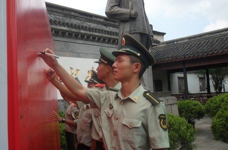 “我決心做黨和人民的忠誠衛(wèi)士,我宣誓忠誠于黨,熱愛人民,報效國家,獻身使命,崇尚榮譽……”,武警官兵們在總理銅像前立下錚錚誓言,并在紅色旗幟上留下自己的心聲。