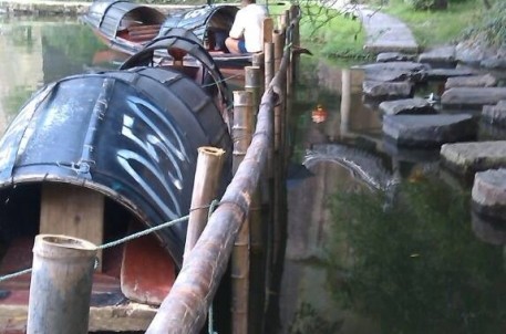 景區(qū)烏大門至寒碧亭間有一段別致的汀步橋,此橋由若干塊長條石交錯的“種”在水中形成的。近日,東湖景區(qū)為考慮游客安全,在汀步橋20公分外“種”上一排毛竹,做成扶欄狀。既提高了游客的安全性,也可以給船工??考{涼提供便利,同時,其簡單自然,而又略帶野趣的設(shè)計(jì)手法又給東湖添一小景。