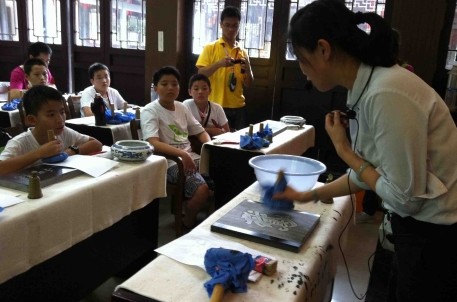 7月11日,來自廣東東莞的200名小學(xué)生來到書法圣地蘭亭參觀,學(xué)習(xí)和體驗(yàn)拓碑工藝,感受中國傳統(tǒng)文化的魅力。在書苑里報(bào)告廳,小朋友們分批參與,先是聽工作人員介紹和演示拓碑的方法,然后兩人一組,按“清潔、上紙、敲打、上墨、晾干”的五步程序,開始自己動(dòng)手制作拓片。在工作人員的耐心指導(dǎo)下,小朋友們對(duì)拓碑表現(xiàn)出了濃厚興趣,拓完后互相展示、比較各自的勞動(dòng)成果,覺得不滿意的紛紛要求再拓一張。最后,每位小朋友開心地將自己做的拓片放進(jìn)書包,表示要帶回家給父母看。