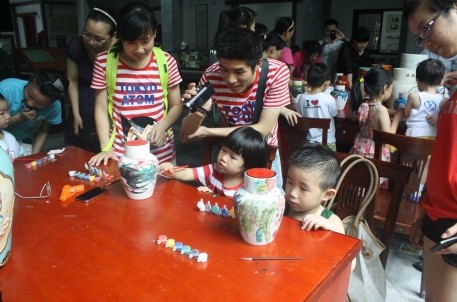 7月8日一大早,平日里莊嚴(yán)安靜的黃酒博物館大廳里變得熱鬧非凡,原來黃酒城來了一群特殊的客人——紹興金寶貝早教中心的小朋友在老師和家長的帶領(lǐng)下,在黃酒城舉辦主題親子活動。小朋友們在講解員的引導(dǎo)下,參觀了黃酒博物館各個展廳、地下酒窖,然后在體驗(yàn)吧開始進(jìn)行今天活動的主題:花雕彩繪。在博物館工藝?yán)蠋煹闹笇?dǎo)下,小朋友們發(fā)揮自己的想象力,在空酒壇上畫出了各種美好的圖案和心愿,家長們也紛紛參與進(jìn)來,有的跟小朋友一起涂鴉,有的忙著拍攝錄像,把這歡樂的場景記錄下來。
