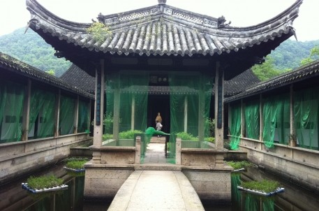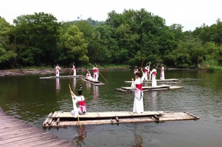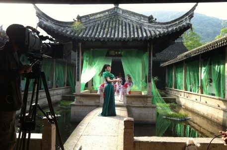 5月2日,MV《情醉中華》在蘭亭景區(qū)拍攝。攝制組花了一整天時間,在樂池和王右軍祠布置取景,并動用了幾十名藝校學(xué)生,配合女主角周燕君反復(fù)拍攝,敬業(yè)精神令人贊嘆。