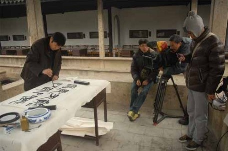 12月15日至16日,蘭亭景區(qū)接待了中央電視臺(tái)的攝制組。據(jù)導(dǎo)演介紹,他們在為臺(tái)北故宮博物院拍攝專題,專門介紹臺(tái)北故宮的100件珍貴藏品,其中有一件與蘭亭有關(guān),是定武本《蘭亭序》真跡。為此,攝制組不遠(yuǎn)千里,追蹤到了紹興蘭亭。拍攝主要從《蘭亭序》的產(chǎn)生和《蘭亭序》在中國書法史上的地位這兩個(gè)角度切入,攝制組表現(xiàn)出了非常認(rèn)真、嚴(yán)謹(jǐn)、專業(yè)、敬業(yè)的工作態(tài)度,即使一個(gè)靜態(tài)的鏡頭也要反復(fù)選擇、錄制、比較,力求盡善盡美。在拍攝過程中,蘭亭景區(qū)副主任、知名書法家喻革良和景區(qū)多位工作人員也協(xié)助和參與其中,喻革良老師為了拍好梁武帝評(píng)價(jià)王羲之書法 “龍?zhí)扉T、虎臥鳳闋” 這八個(gè)字,就反復(fù)書寫了很多張。拍攝完畢時(shí),他把最滿意的一張作品蓋上章送給了攝制組,讓導(dǎo)演異常興奮,一直感嘆不虛此行,并表示要把作品掛在工作室里,讓大家記住蘭亭之行。