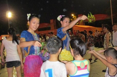 當(dāng)晚,稽山園鑒水苑廣場,流光溢彩,人頭攢動。傣族姑娘向市民潑灑吉祥水,送上了她們夏日最真摯的祝福,也讓市民朋友感受了一番浪漫的傣族風(fēng)情。婀娜多姿的水鄉(xiāng)姑娘們在音樂噴泉中翩翩起舞,吸引著廣場上每一位市民的眼球。激情的舞蹈、涌動的噴泉、澎湃的音樂點燃了全場潑水的熱情。整個潑水狂歡活動充滿了歡樂,充滿了笑聲,市民們踴躍參與到水中拔河、背人水戰(zhàn)、男女PK賽等互動活動中,樂翻了天。他們拿著小臉盆相互追逐、潑水嬉戲、縱情狂歡,盡情享受著清涼水世界的樂趣。最快樂當(dāng)然是孩子們,他們奔跑、嬉笑、潑水,雖然全身濕透了,但快樂卻始終洋溢在他們臉上。