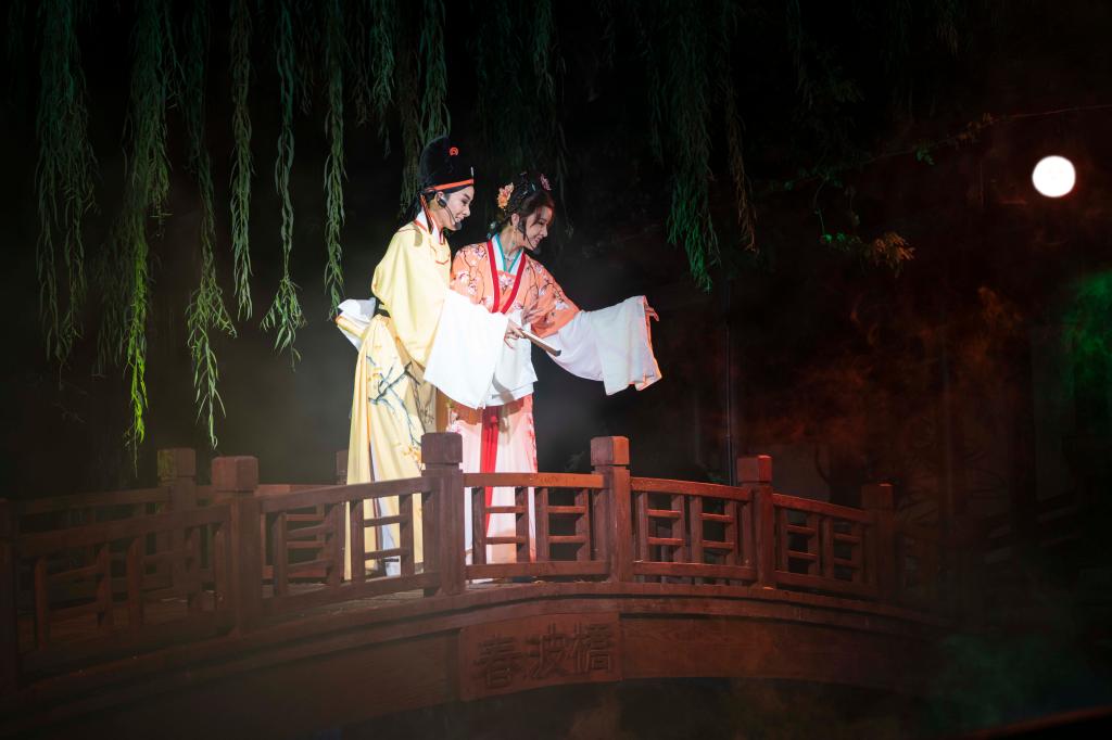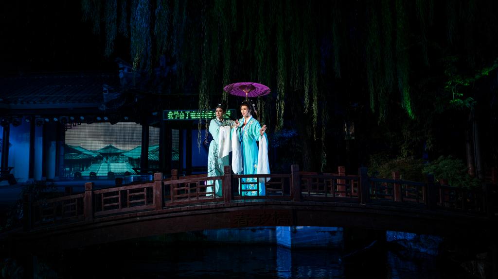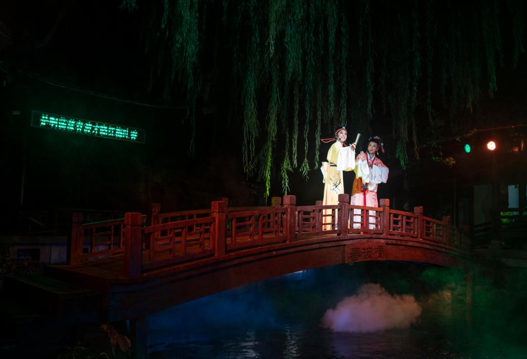 夜幕下的沈氏園清雅古典,燈光交相呼應,園林景致疏密有致,游客漫步其中如夢如幻。新版“沈園之夜”堂會演出以紹興越劇為主,穿插落花落、紹劇、平湖調等紹興本土劇種,以“游園”、“別園”、“歸園”、“題園”、“惜園”五大板塊,生動演繹沈園這個宋代名園的浪漫柔美和陸游與唐琬悲涼凄美的愛情故事。