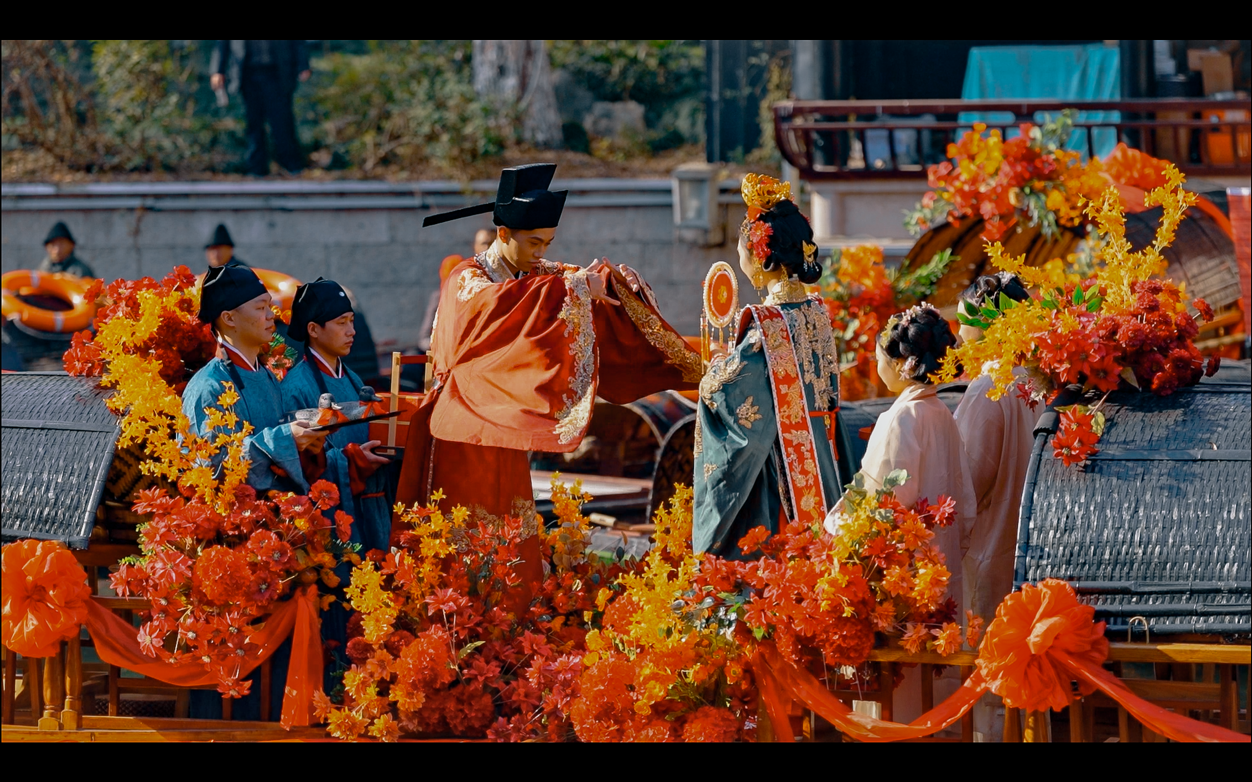 在城市廣場水域,開啟一場老紹興水上迎親巡游,伴隨著熱鬧的鑼鼓、喜慶的嗩吶,新人攜手一起跨火盆、過馬鞍、挑蓋頭、拜天地、許誓言,向大家分撒喜糖。在鼓樂聲中,一對新人坐著烏篷水上巡游,將浪漫演繹到極致。圍觀群眾可以加入迎親的船隊,沾沾新人喜氣。新人在眾人的祝福中完成一場傳統(tǒng)水上婚禮,攜手開啟幸福人生。