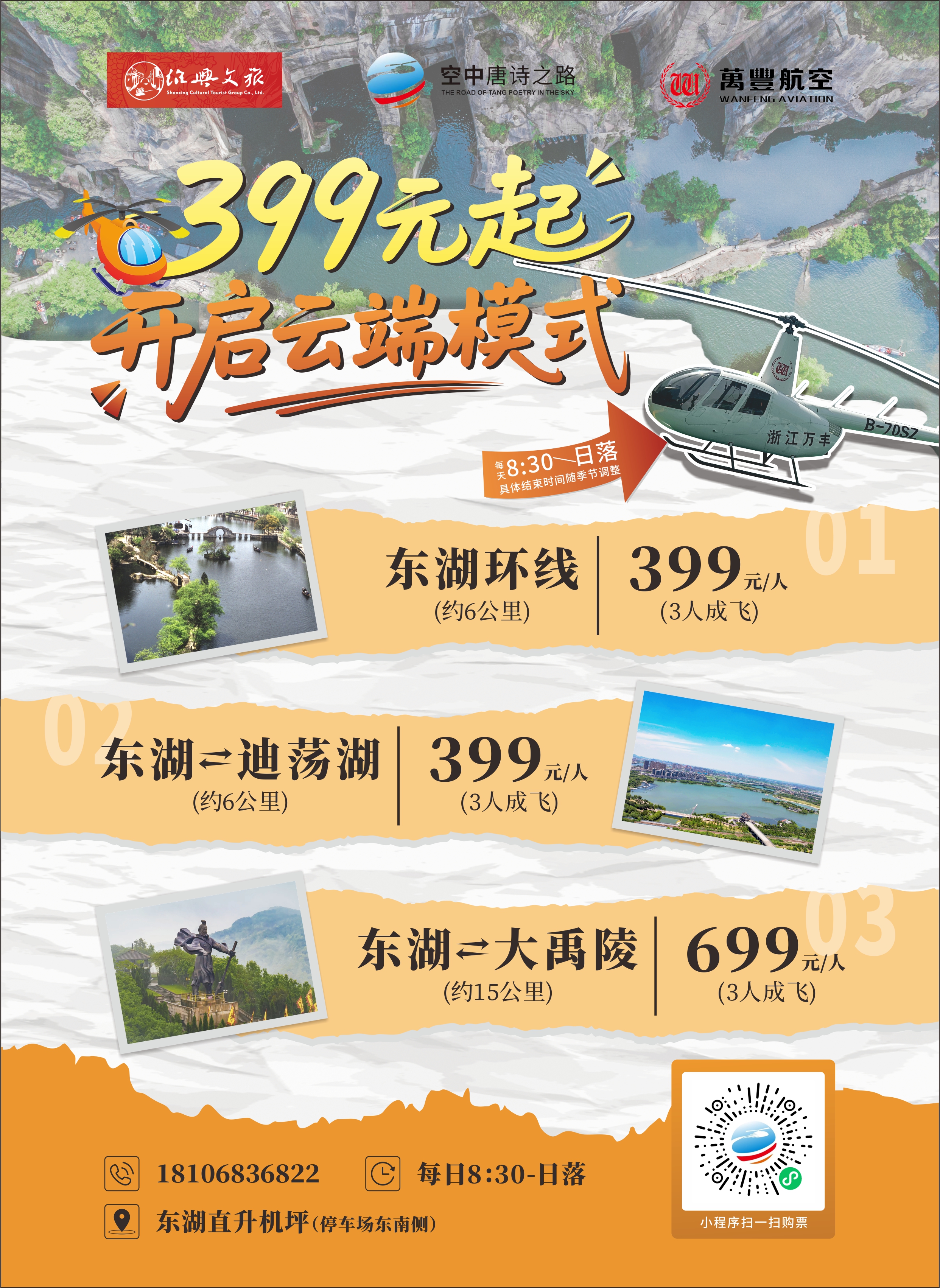 東湖到大禹陵航線,全程15公里。售票價格為699元/人。直升機沿著二環(huán)東路飛行,游客可一路看遍大禹陵風(fēng)景,打卡大禹紀(jì)念館,重溫大禹三過家門而不入的治水故事;致敬大禹銅像,感受腳踏巨舟,屹立石帆山頂?shù)男蹅鈩荨4撕骄€故事細膩,底蘊深厚,是空中唐詩之路航線中的文化專列。