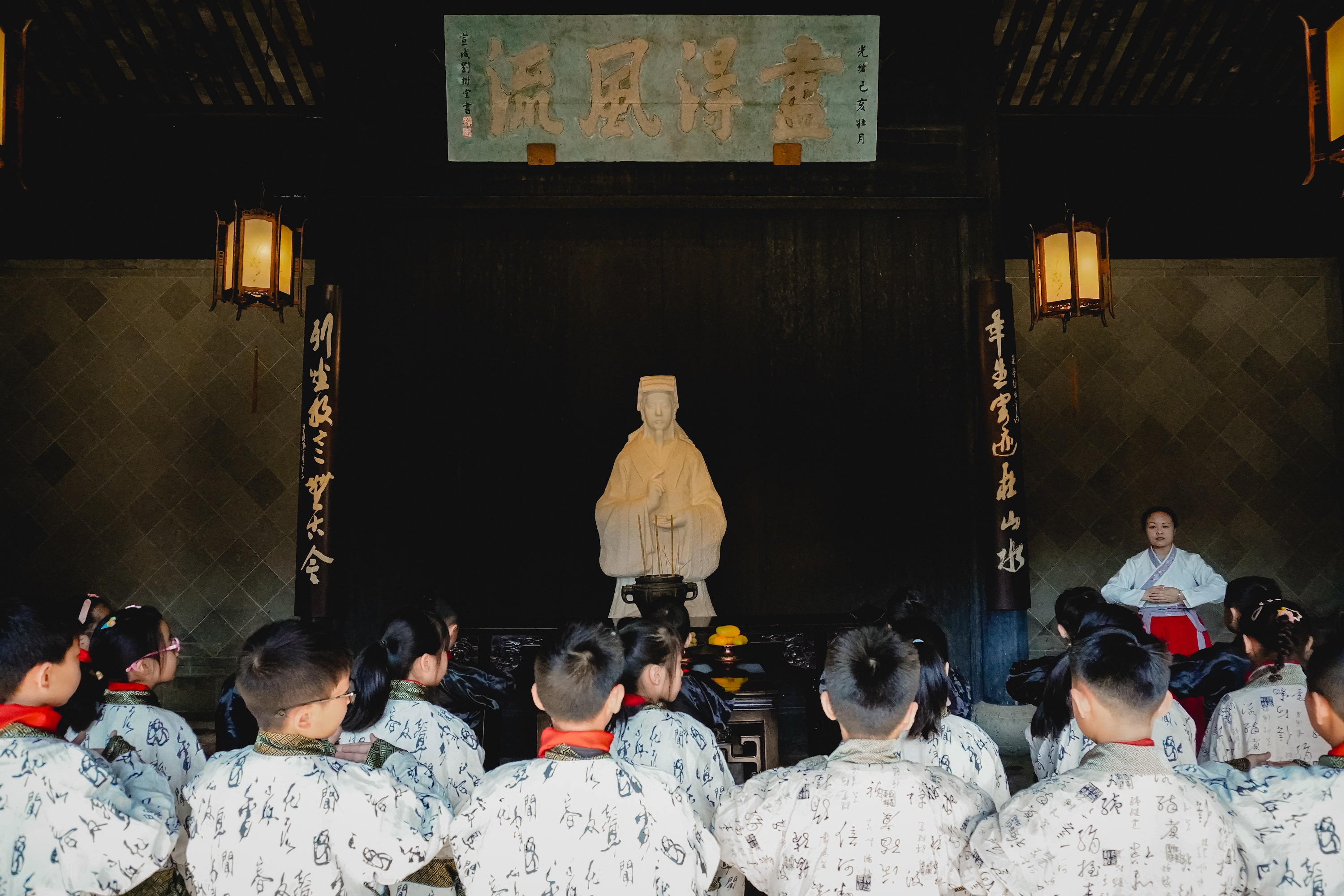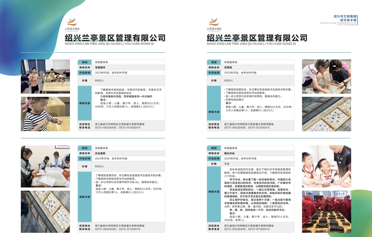 ì1+X模式,1為參觀景區(qū),X為自選課程,其中扇面描紅、石刻拓碑、曲水流觴、活字印刷、木刻版畫、臨摹蘭亭序、手工課堂成為最受學(xué)生歡迎的主題課程。
