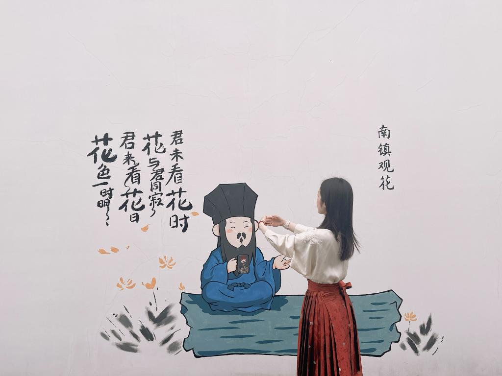 在紀(jì)念館一樓繪制了一幅南鎮(zhèn)觀花打卡墻,讓游客能夠與陽(yáng)明先生進(jìn)行合影。