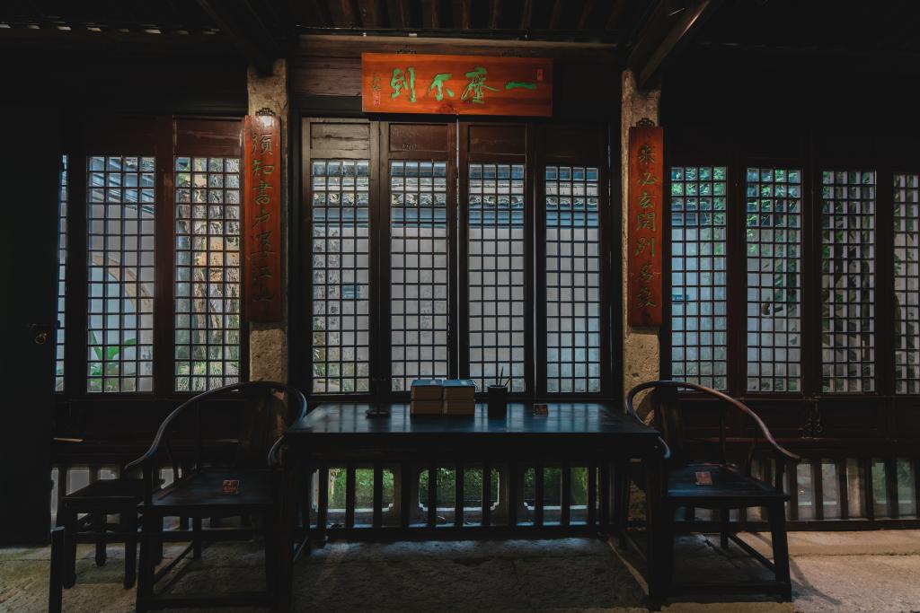 前室中間正上方掛有明代書畫家陳洪綬手書的“青藤書屋”匾,下方為徐渭的自畫像。畫像邊有對聯(lián)“幾間東倒西歪屋,一個南腔北調(diào)人”,上聯(lián)講的是徐渭晚年生活的清苦,下聯(lián)是對自身的藝術寫照。西側墻上掛有隸書匾對聯(lián)“牽蘿補屋王玉瑛,因樹作堂陳老蓮”。在朝南窗戶上方的“一塵不到”匾,為徐渭手跡。對聯(lián)“未必玄關別名教,須知書戶孕江山”,上聯(lián)的“玄關”,指居室外門。全聯(lián)意是:庭院的外門未必能隔絕名聲與教化,要知道小小書屋能包容天下江山。由此可見徐渭高雅的情趣和非凡的抱負。