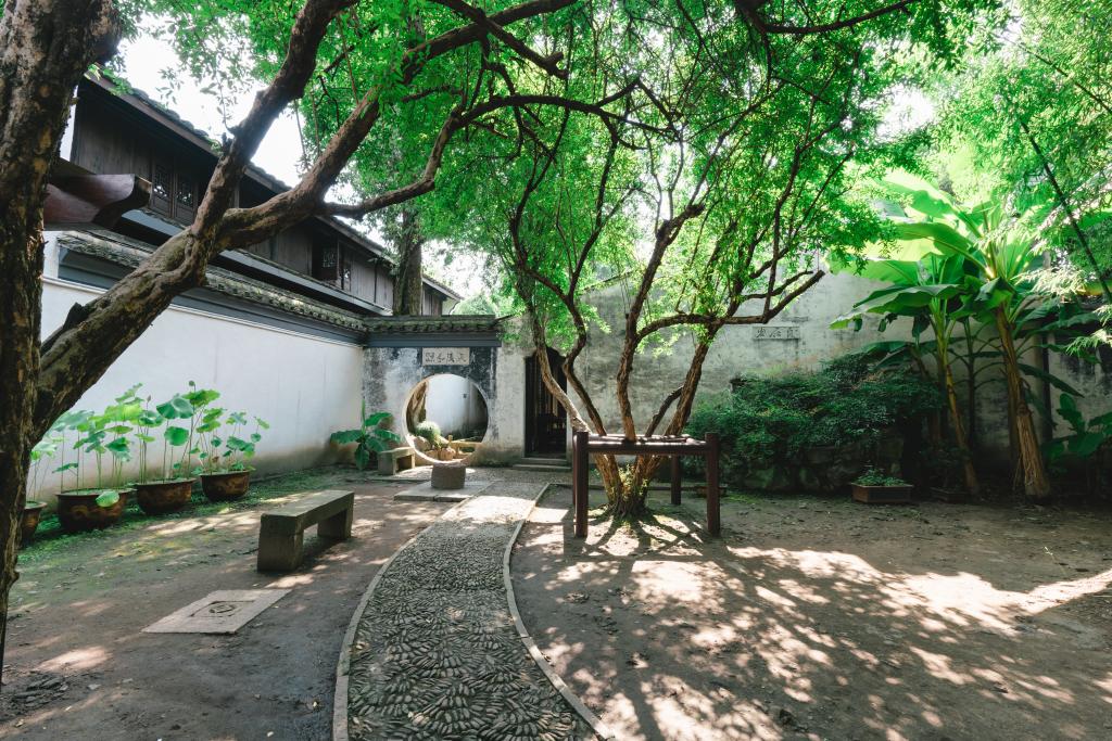 青藤書(shū)屋坐北朝南,系石柱墻硬山造木格花窗平屋,共兩室。庭院則是徐渭讀書(shū)之余游嬉、散步的地方。庭園面積較大,竹子、芭蕉、石榴等植物錯(cuò)落有致,有鵝卵碎石曲徑,墻上書(shū)“自在巖”,為現(xiàn)存青藤八景之一。