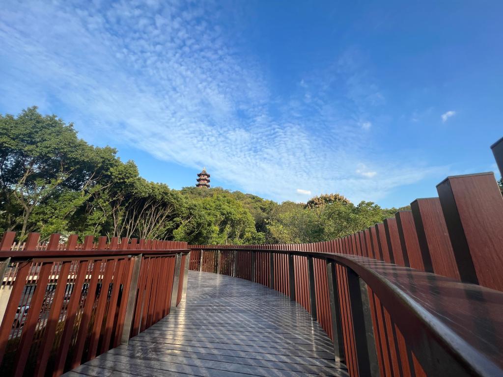 蕺山棧道連接古城北入口文化公園游步道和蕺山山體,總長約170米,平均高度約8米,步道寬2.3米。通過旋梯下連古色古香的游步道,上通“S”形廊橋,直達(dá)蕺山之巔—文筆塔。登塔俯瞰棧道,只見棧道隱掩于綠蔭之中,宛若游龍,古樸的木色棧道與古色古香的游步道相連,旁邊層樓疊榭,氣韻流暢。當(dāng)夜幕降臨,燈光點(diǎn)綴,悠悠古韻與綠色生態(tài)相融,成為紹興城市夜晚最美的風(fēng)景。