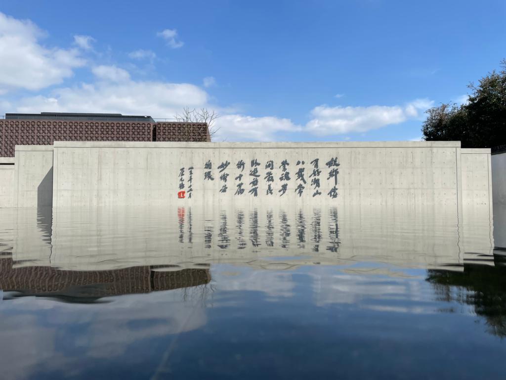 孑民圖書館前的照壁以青灰色石材打造,古樸典雅,正中鐫刻著蔡元培先生手書詩作:“故鄉(xiāng)盡有好湖山,八載??M魂夢間。 最羨臥游君有術(shù),十篇妙繪若循環(huán)。