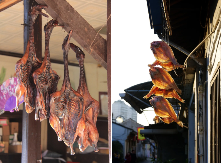 每到冬日,有手藝的老紹興人就開啟醬貨日程,晾衣竿成了晾醬貨的專用,有太陽的角落都成為醬貨的主場。