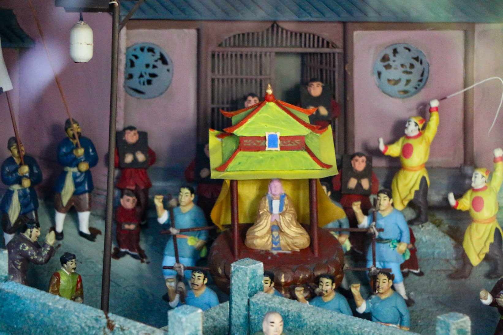 第三進(jìn)為“迎神賽會(huì)”。主要用大型微縮景觀的展示方式配以簡(jiǎn)明的歷史淵源說明,在有限的空間里盡量地展現(xiàn)“迎神賽會(huì)”的壯觀場(chǎng)面:游行隊(duì)伍正在抬神巡行,鳴鑼喝道,火銃震天。有舞獅、舞龍的,踩高蹺、調(diào)無常的,人山人海,熱鬧非凡。人們駐足觀望,街上店鋪林立,遠(yuǎn)處幾座大山隱約在望,近處河上還嬉戲著幾只白鵝。