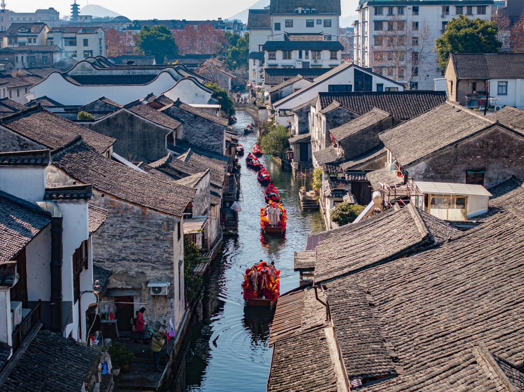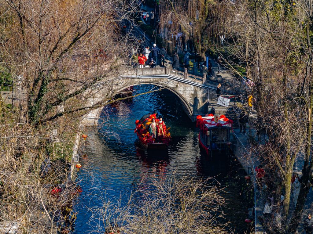 在城市廣場水域,開啟一場老紹興水上迎親巡游,伴隨著熱鬧的鑼鼓、喜慶的嗩吶,新人攜手一起跨火盆、過馬鞍、挑蓋頭、拜天地、許誓言,向大家分撒喜糖。在鼓樂聲中,一對新人坐著烏篷水上巡游,將浪漫演繹到極致。圍觀群眾可以加入迎親的船隊,沾沾新人喜氣。新人在眾人的祝福中完成一場傳統(tǒng)水上婚禮,攜手開啟幸福人生。