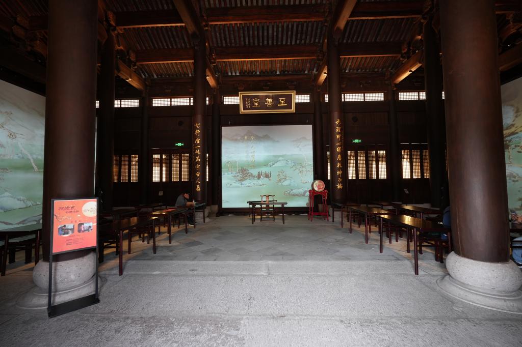 至善堂是王陽(yáng)明故居第三進(jìn),現(xiàn)為數(shù)字劇場(chǎng)空間,通過(guò)投影技術(shù)再現(xiàn)王陽(yáng)明講學(xué)場(chǎng)景。兩側(cè)展墻展出的是“王陽(yáng)明的生平與思想——以居越生活為中心”的展覽:從“龍場(chǎng)悟道”創(chuàng)立心學(xué),到南贛平亂踐行“知行合一”;從智擒寧王展現(xiàn)軍事才華,到思田招撫彰顯政治智慧。展覽還特別呈現(xiàn)了王陽(yáng)明的重要思想節(jié)點(diǎn),如天泉證道,論萬(wàn)物一體,完整勾勒出一代心學(xué)宗師“真三不朽”的生命軌跡與思想體系。