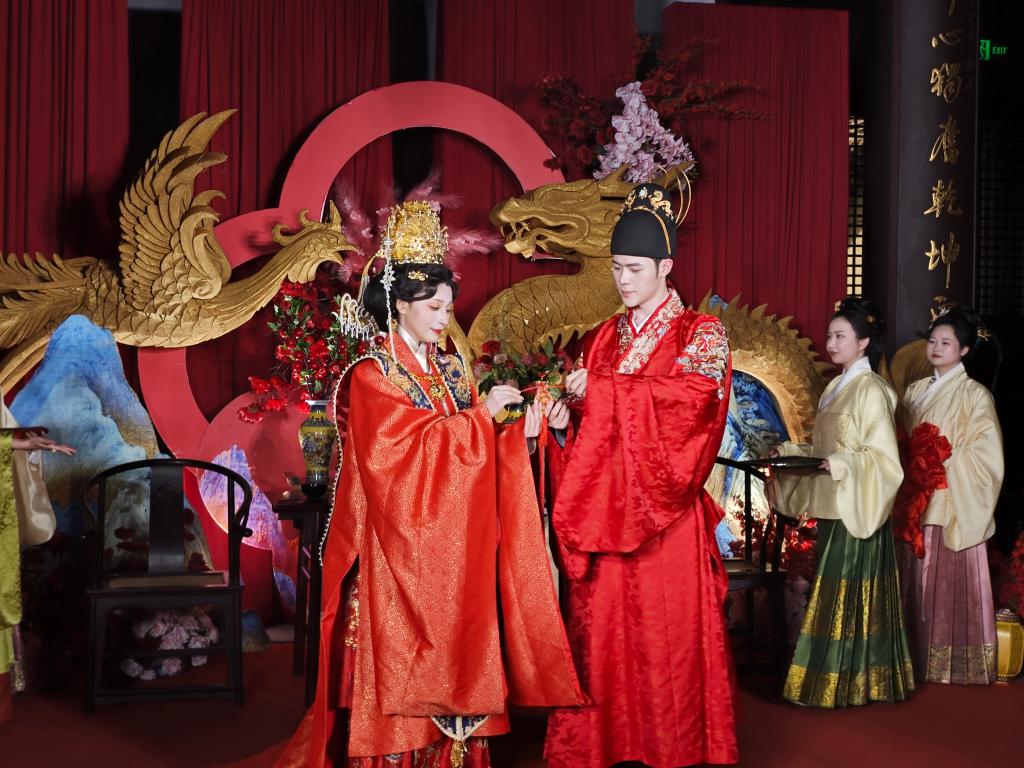 2.至善堂主儀式:執(zhí)禮啟禮,喜娘祈福暖堂,新人在至善堂內(nèi)行盟誓、結(jié)發(fā)、合巹等流程。
