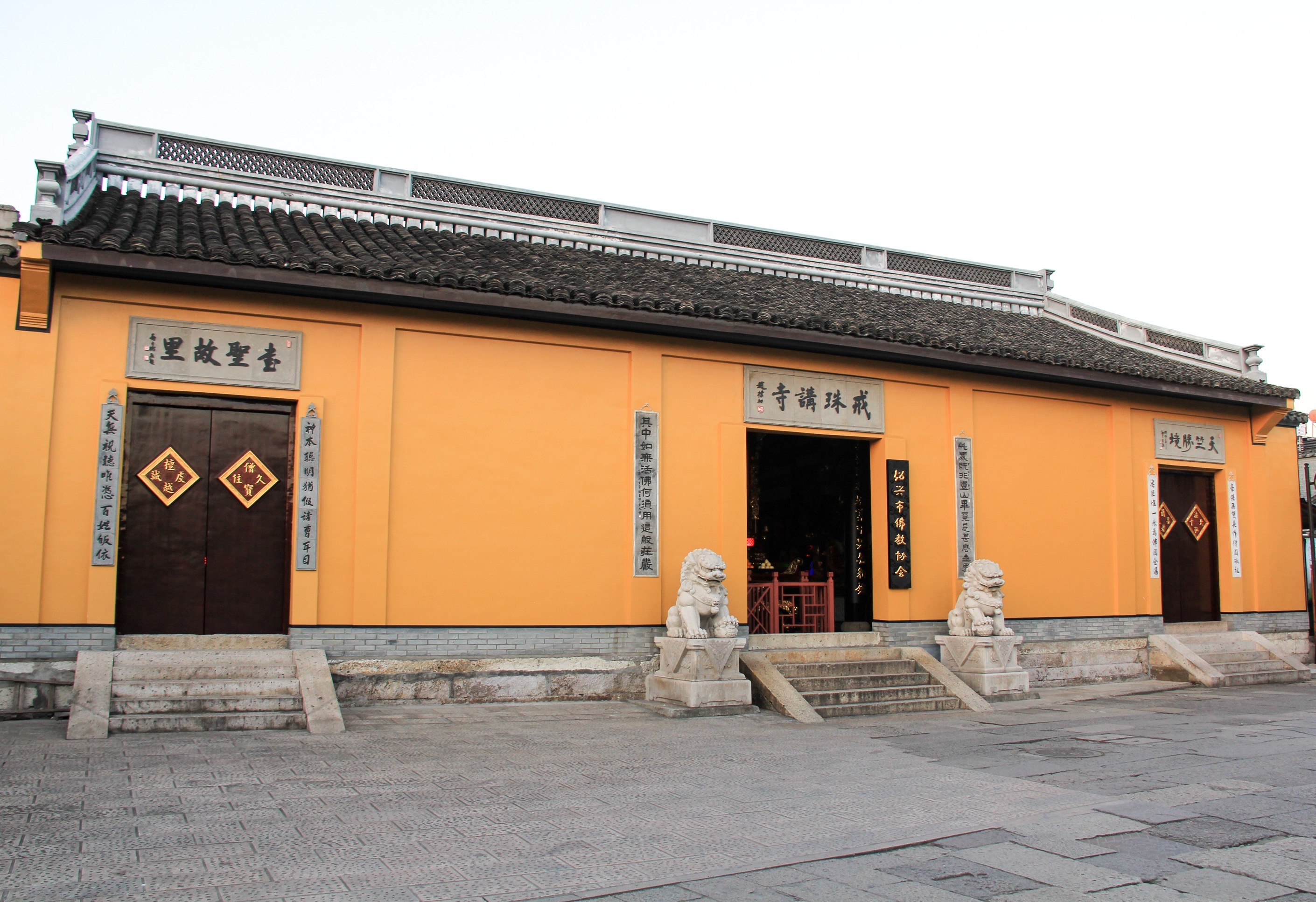 戒珠講寺位于蕺山南麓西街72號(hào),原為“書(shū)圣”王羲之的故宅。相傳王羲之癖珠,曾失落寶珠,疑心是老僧所竊。老僧無(wú)端遭受不白之冤,有口難辯,抑郁而終。數(shù)日后,羲之發(fā)現(xiàn)寶珠是自家白鵝誤吞,悔憾不已,便舍宅為寺紀(jì)念老僧。從唐代開(kāi)始它被定名“戒珠寺”。起名“戒珠”的原因有兩點(diǎn):一是因?yàn)橥豸酥倪@個(gè)故事。二是取自《法華經(jīng)?序品》中的“精進(jìn)持凈戒,猶如護(hù)明珠”。