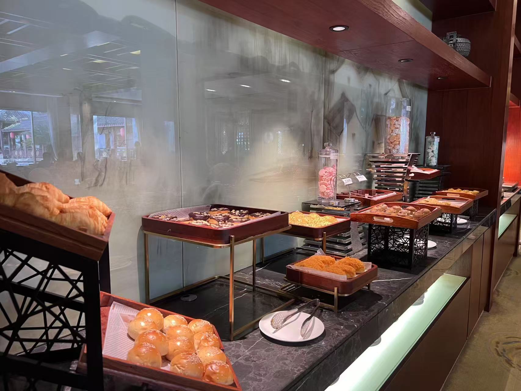 紹興飯店自助早餐廳位于紹興飯店北門(mén)知遇樓一樓,江南庭院風(fēng)格,靠窗座位可直觀感受小橋流水環(huán)繞。餐廳可同時(shí)容納近150人用餐,涵蓋了中式、常規(guī)西式及本地傳統(tǒng)小吃近百余個(gè)品種,最受青睞的小食有:梅干菜燒餅、蘿卜絲餅、生煎包及各種蒸點(diǎn),如小籠包、狀元糕等。品種豐富、食材新鮮、手作出品,可滿足不同顧客的口味?。江南園林式環(huán)境配上地道紹興美食,是飯店早餐的核心競(jìng)爭(zhēng)力,飯店的詩(shī)畫(huà)江南味和餐廳的人間煙火氣,收到住客和游客的一致好評(píng)。