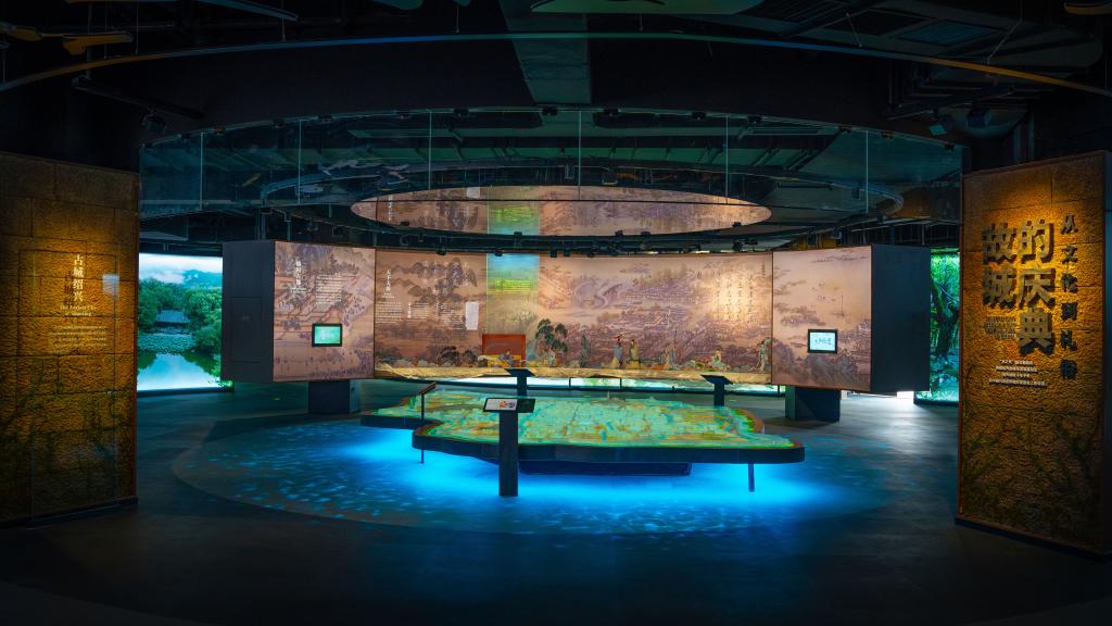 紹興古城位于北緯30°線上,展廳內(nèi)由古及今地展示紹興這座歷史古城。紹興,作為全國(guó)著名的“水城”,它緣水而起、因水而興、以水而名,千年故往與水有著不解之緣。展廳陳列以“水脈”為血肉,串聯(lián)起這座古城所有的故事