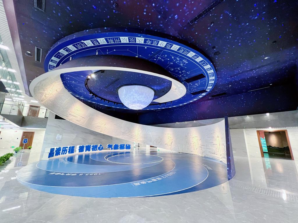 紹興氣象博物館的序廳,中間是主題造型建筑,以飛舞向上的螺旋造型浮雕和頂部星空天花造型為基礎(chǔ),螺旋向上的浮雕體現(xiàn)氣象從古到今的現(xiàn)代化發(fā)展歷程,頂部天花為中國(guó)二十八星宿天文圖,展示氣象與天文之間的密切關(guān)系,眾所周知的二十四節(jié)氣就是由我國(guó)古人在觀察地球繞日公轉(zhuǎn),日影長(zhǎng)度的變化而歸納總結(jié)出