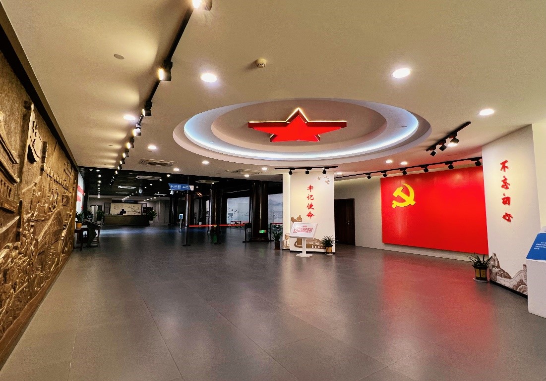 宣誓區(qū)以黨旗為背景,以五角星為鑿井,莊重肅穆。團(tuán)隊可以在此莊嚴(yán)宣誓,重溫入黨誓詞,牢記使命,不忘初心。宣誓廳對面是個淺浮雕墻,是以詩文“航跡”為創(chuàng)作原點(diǎn),展開聯(lián)想,講述黨的建設(shè)發(fā)展歷程