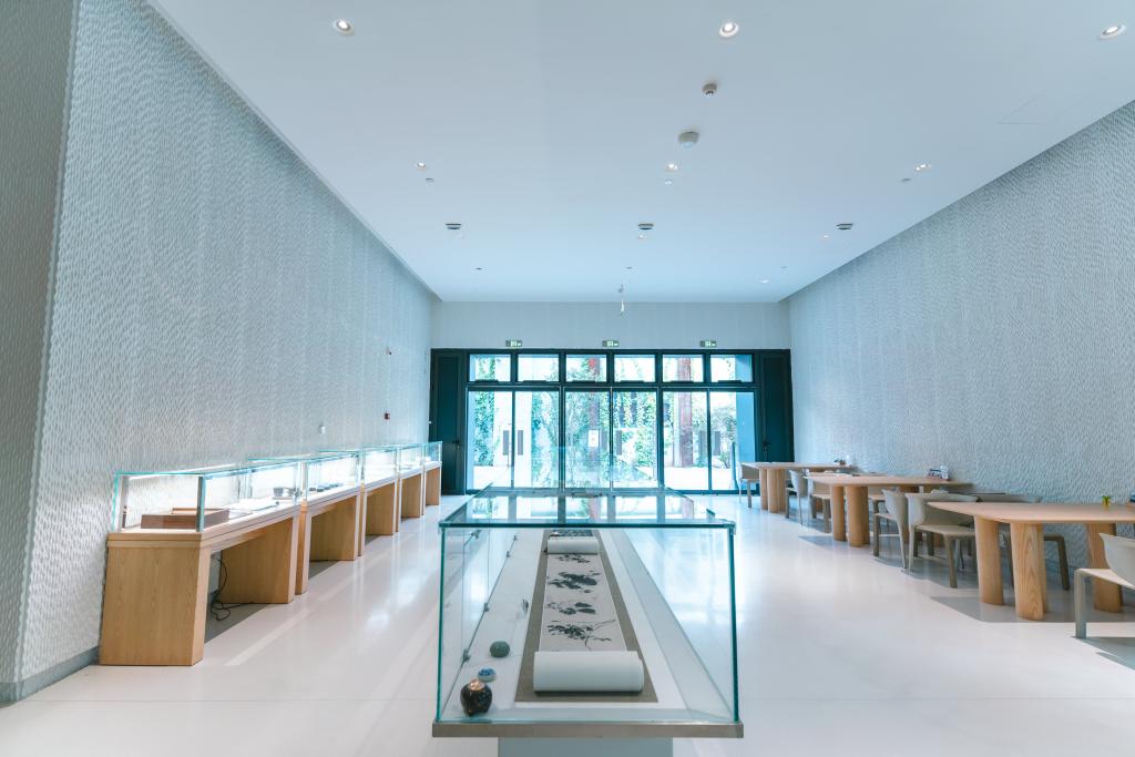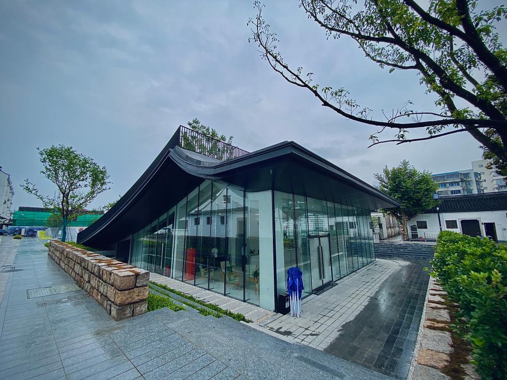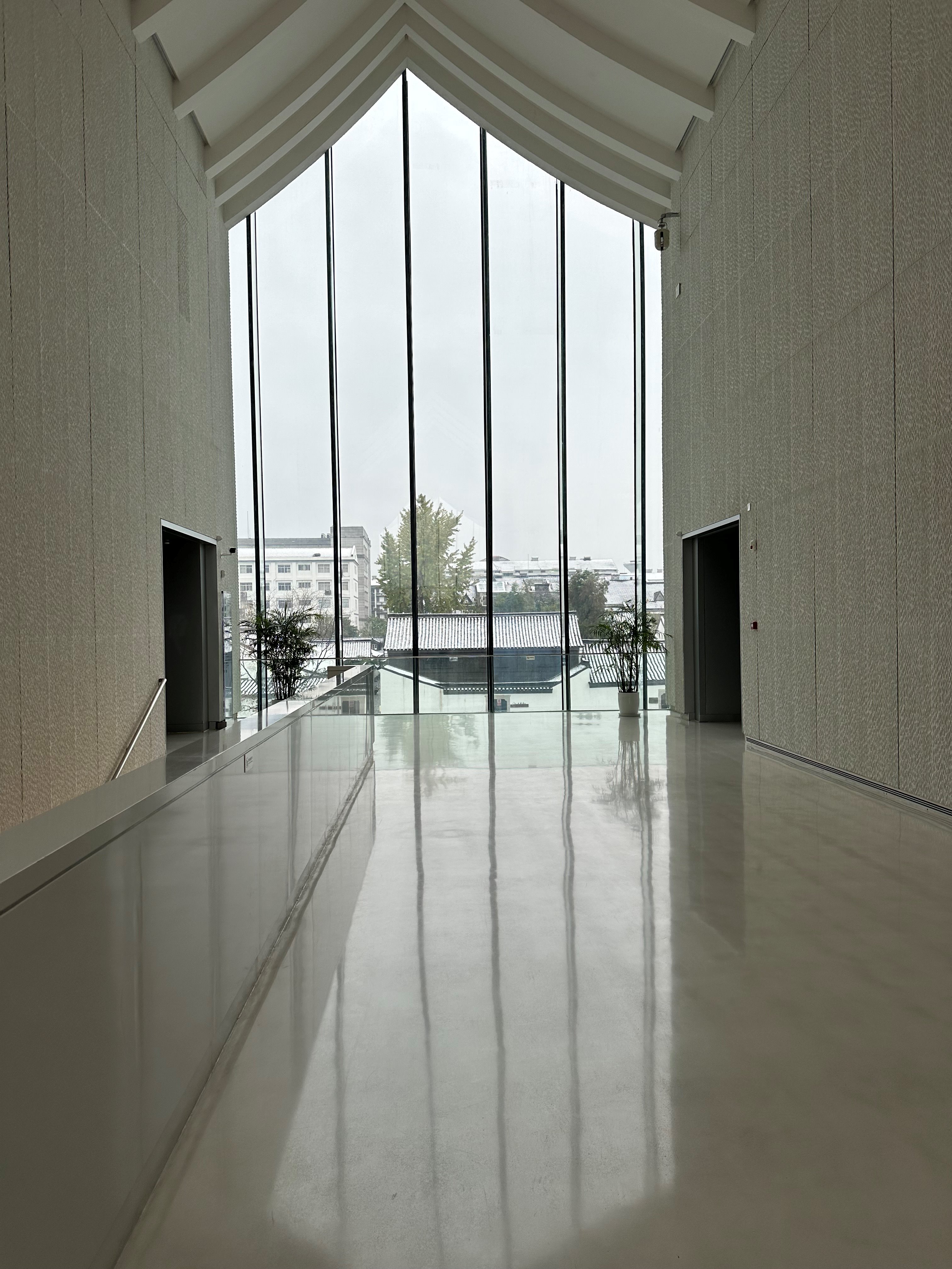 徐渭藝術(shù)館二樓的大面玻璃墻簡約而富有格調(diào),呈尖頂形態(tài),將室外建筑、樹木與天光引入室內(nèi),營造出通透、靜謐且融合自然與建筑美學(xué)的氛圍