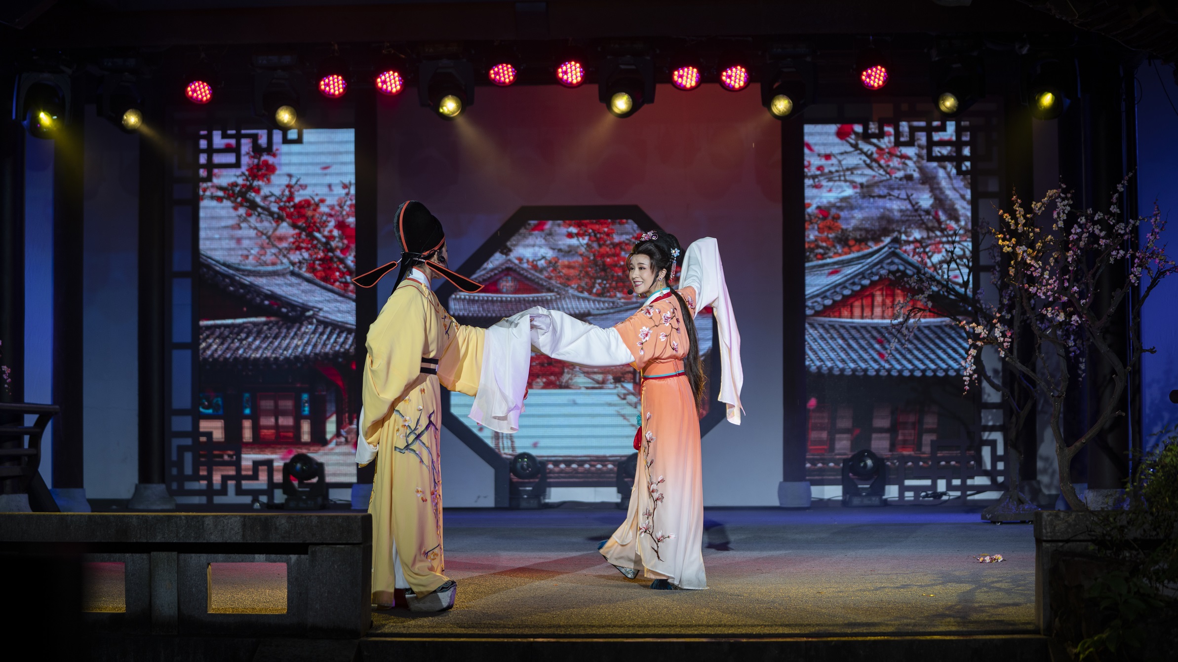 50 分鐘演出時間,讓人看得明白,也讓人理解更深刻,升華了愛情主題。新版《沈園之夜》還提升整體的表演品質(zhì),增加了燈光、舞美、視頻,內(nèi)涵豐富,觀賞的層次提升。在音樂上,新版《沈園之夜》有了全新面貌,紹興戲曲元素豐富,吸收了紹興曲藝,也吸收了現(xiàn)代音樂手段,如合唱、交響樂等,氣勢雄偉,給人全新感覺。 新版《沈園之夜》是一臺園林實景演出,越劇、蓮花落、紹劇、鸚哥調(diào)等多種音樂元素,使優(yōu)美的愛情故事更加動人,整臺演出婉約而又磅礴大氣,纏綿而不喪氣、低沉?,F(xiàn)場表演在沈園橋間廊邊進(jìn)行,加上水鄉(xiāng)風(fēng)景的配置和屏上互動,引導(dǎo)觀眾走入一闋優(yōu)美的《釵頭鳳》中,讓人感到整臺戲曲子美、意境美。<